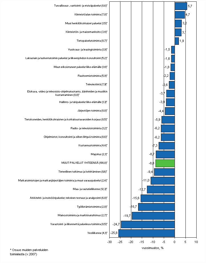 Vuoden 2009 kolmannella neljänneksellä kehitys oli suotuisinta turvallisuus, vartiointi-, ja etsiväpalveluissa, joiden liikevaihto oli 5,7 prosenttia suurempi kuin vuotta aiemmin. Kiinteistöalan toiminnan liikevaihto kasvoi 4,7 prosenttia. Yli 3 prosentin kasvuun ylsivät muiden henkilökohtaisten palveluiden sekä kiinteistön- ja maisemanhoidon toimialat. Vesiliikenteen sekä varastoinnin ja liikennettä palvelevan toiminnan toimialojen liikevaihdot supistuivat yli 20 prosenttia. Mainostoiminnan ja markkinointitutkimuksen liikevaihto väheni tarkastelujaksolla lähes 20 prosenttia. Työllistämistoiminnan, arkkitehti- ja insinööripalveluiden sekä teknisen testauksen ja analysoinnin toimialojen liikevaihto supistui tarkastelujaksolla yli 15 prosenttia vuodentakaisesta