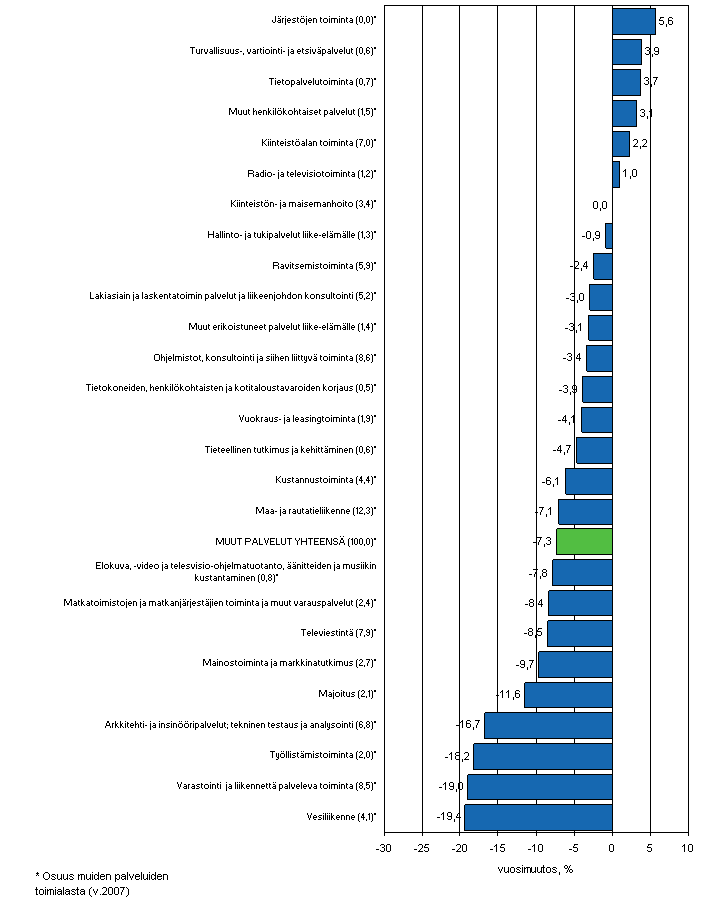 | Palvelualat yhteensä (pl. kauppa) | -3,8 | -8,2 | -9,3 | -7,3 | -7,2 |