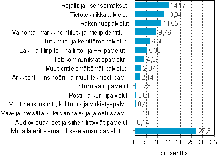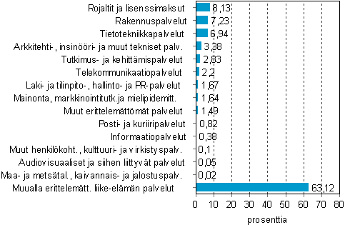 | Muualla erittelemättömät liike-elämän palvelut ml. välityskauppa, käyttöleasing ja muualla luokittelemattomat konsernien sisäiset palvelut | 323,8 | 26 | 393,4 | 28 |