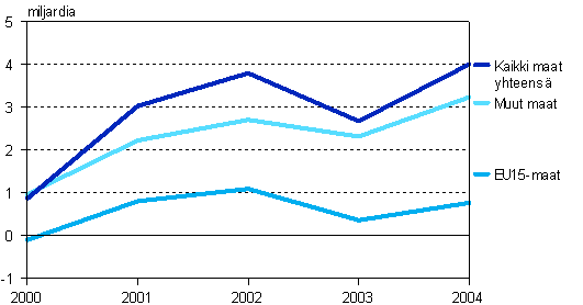 Palvelukaupan tase vuosina 2000-2004 alueittain, miljardia euroa