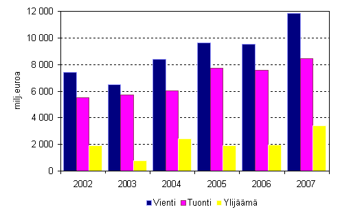 Palvelujen ulkomaankaupan vienti, tuonti ja ylijäämä 2002-2007, miljoonaa euroa