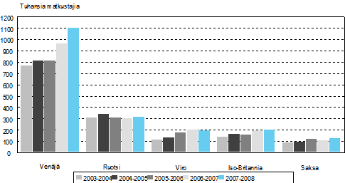 Talvikaudella - marraskuun 2007 ja huhtikuun 2008 välisenä aikana - Suomessa vieraili kaikkiaan 2,5 miljoonaa ulkomaista matkustajaa. Matkustajamäärä kasvoi 9 prosenttia edellisestä talvikaudesta. Eniten matkustajia saapui Venäjältä, josta tulleiden matkustajien määrä lisääntyi 15 prosenttia edellistalvesta. Venäjältä Suomeen tuli kaikkiaan 1,1 miljoonaa matkustajaa. Venäjältä tehdyistä matkoista lähes 70 prosenttia oli päivämatkoja, joihin ei sisältynyt yöpymistä Suomessa. Pääasialliseksi matkan syyksi kolmannes Venäjältä tulleista mainitsi ostokset.