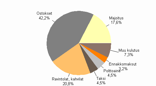 Suomessa työmatkalla oli ulkomaisista matkustajista 25 prosenttia ja vapaa-ajan matkalla 43 prosenttia. Tuttavien tai sukulaisten luona vieraili 12 prosenttia matkustajista. Työmatkalla olleet jättivät Suomeen rahaa 597 miljoonaa euroa, vapaa-ajan matkustajat 683 miljoonaa euroa ja tuttavien tai sukulaisten luona vierailleet 202 miljoonaa euroa. Loput 1,7 miljardin kokonaissummasta lukeutuu muihin matkatyyppeihin, mm. yhdistelmämatkat. Työmatkalaisten kulutuksesta kolmannes meni majoitukseen, neljännes ravintoloihin ja kahviloihin sekä neljännes ostoksiin. Vapaa-ajanmatkustajat taas käyttivät jopa 54 prosenttia kulutuksestaan ostoksiin, viidenneksen ravintoloihin ja kahviloihin sekä kymmenesosan majoitukseen.
