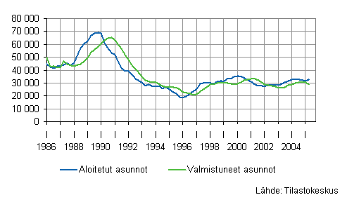 Aloitetut ja valmistuneet asunnot, liukuvat vuosisummat, kpl