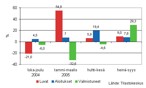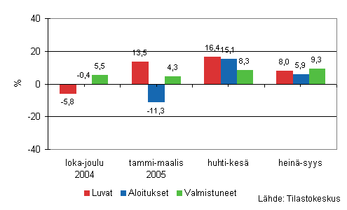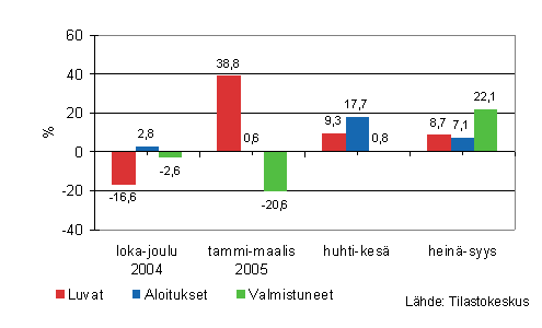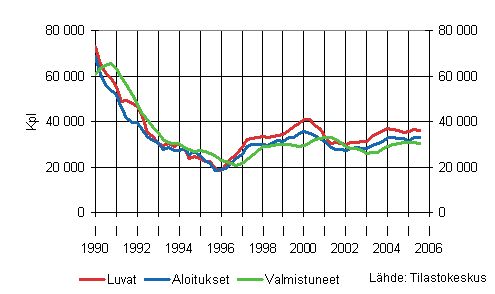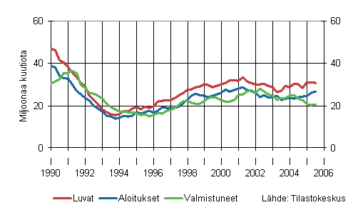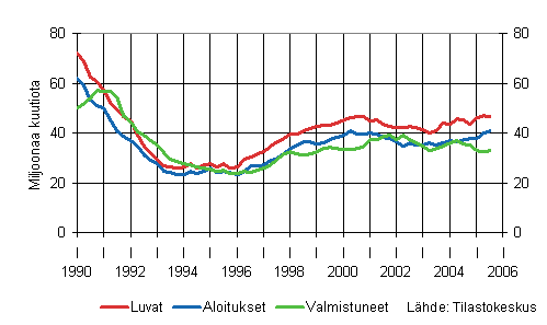 Rakennusluvanvarainen uudisrakentaminen vuoden 2005 kolmannella neljänneksellä oli vilkkaampaa kuin vastaavalla ajanjaksolla vuotta aiemmin. Myönnettyjen rakennuslupien, aloitettujen rakennusten ja valmistuneiden rakennusten kuutioilla mitatut määrät kasvoivat selvästi. Rakennusluvanvarainen uudisrakentaminen on nyt saavuttanut vuoden 2000 tason, mikä oli kuutioilla mitatun rakentamisen huippuvuosi 1990-luvun alun laman jälkeen. Tänä vuonna rakentamisen kasvua on ylläpitänyt vakaana jatkuvan asuinrakentamisen kasvun ohella vilkastunut teollisuus- ja varastorakennusten sekä maatalousrakennusten rakentaminen.