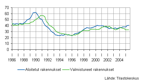Aloitetut ja valmistuneet rakennukset, liukuvat vuosisummat, miljoonaa kuutiota