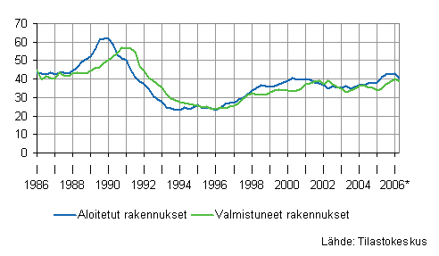 Aloitetut ja valmistuneet rakennukset, liukuvat vuosisummat, miljoonaa kuutiota