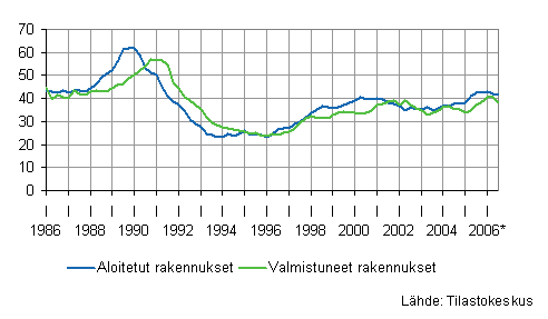 Aloitetut ja valmistuneet rakennukset, liukuvat vuosisummat, miljoonaa kuutiota