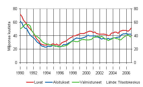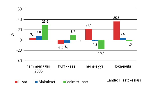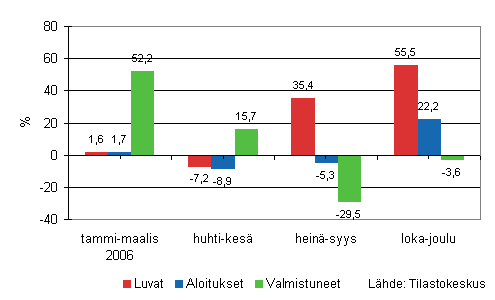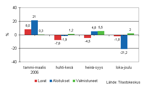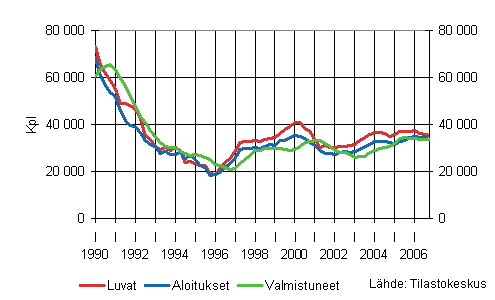 Luvanvaraisia rakennushankkeita käynnistettiin kuutioilla mitattuna vuonna 2006 lähes yhtä paljon kuin vuonna 2005. Vuoden toisella ja kolmannella neljänneksellä aloitusten määrä antoi viitteitä uudisrakentamisen hiipumisesta, mutta vuoden viimeisellä neljänneksellä hankkeita aloitettiin kuitenkin jälleen edellisvuotista enemmän. Myös myönnettyjen rakennuslupien avulla tarkasteltuna vuosi 2006 oli kaksijakoinen. Alkuvuodesta lupia myönnettiin edellisvuotista vähemmän kun taas loppuvuodesta kuutioilla mitattu lupamäärä kasvoi reilusti. Lupamäärän voimakas kasvu ennakoi uudisrakentamisen säilyvän vilkkaana myös lähitulevaisuudessa.