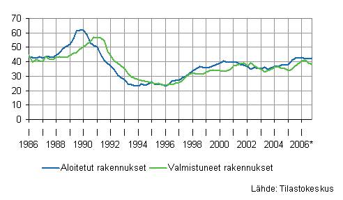 Aloitetut ja valmistuneet rakennukset, liukuvat vuosisummat, miljoonaa kuutiota