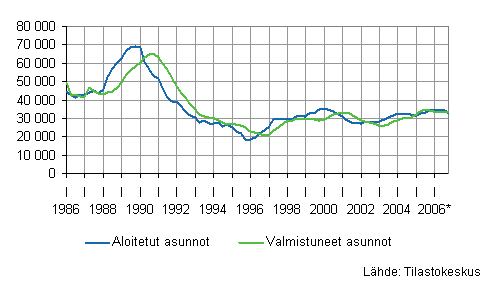 Aloitetut ja valmistuneet asunnot, liukuvat vuosisummat, kpl