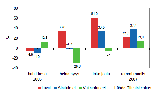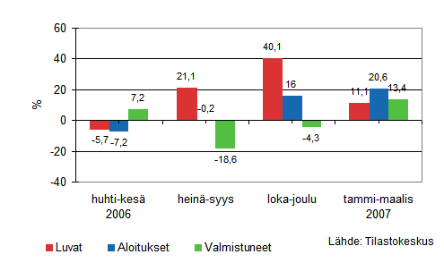 Luvanvaraisia rakennushankkeita käynnistettiin kuutioilla mitattuna tammi-maaliskuussa 21 prosenttia enemmän kuin vastaavalla ajanjaksolla vuotta aiemmin. Myös valmistuneiden rakennusten kuutiomäärä kasvoi 13 prosenttia ja myönnettyjen rakennuslupienkin mukainen kuutiomäärä 11 prosenttia edellisvuodesta. Asuinrakentamisen kasvu on taittunut, mutta uudisrakentamisen kasvua ylläpitää muun talonrakentamisen vilkastuminen. Lupamäärän kasvu ennakoi uudisrakentamisen säilyvän vilkkaana myös lähitulevaisuudessa.