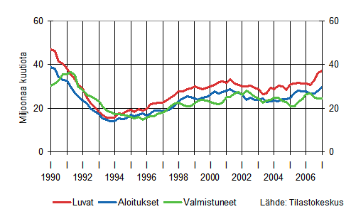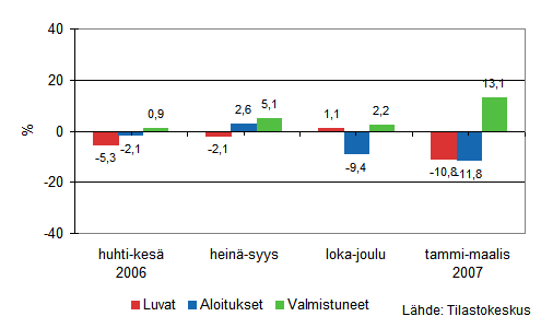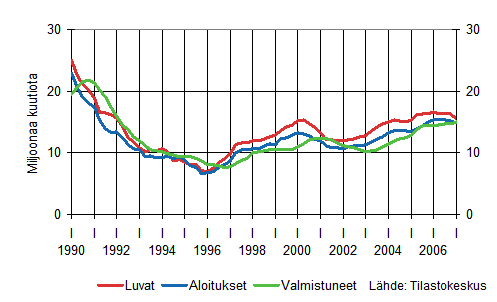 Asuinrakentamisen vuosia jatkunut kasvu tasaantui vuonna 2006 ja on kääntynyt jopa hienoiseksi laskuksi viimeisten vuosineljännesten aikana. Vuonna 2006 rakennuslupia uusille asunnoille myönnettiin 2 prosenttia vähemmän kuin vuotta aiemmin. Uusia asuntoja aloitettiin rakentamaan 1 prosentti vähemmän ja valmistuneidenkin asuntojen kappalemäärä väheni 1 prosentin vuodentakaisesta. Vuoden 2007 ensimmäisellä neljänneksellä asuinrakennuksille myönnettiin lupia ja niitä aloitettiin noin 10 prosenttia vähemmän kuin vuotta aiemmin.