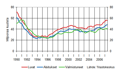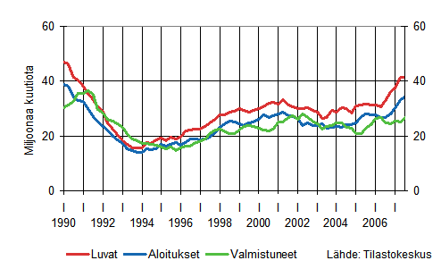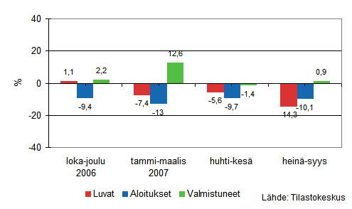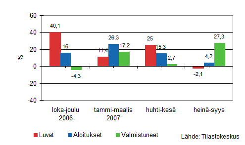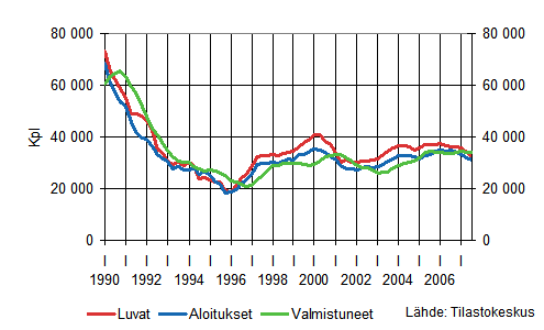 Asuinrakentamisen vuosia jatkunut kasvu tasaantui vuonna 2006 ja on kääntynyt laskuksi vuonna 2007. Tammi-syyskuussa aloitettiin noin 24 700 uuden asunnon rakennustyöt, mikä on lähes 3 000 asuntoa vähemmän kuin vastaavana ajanjaksona vuotta aiemmin. Aloitusten väheneminen näkyy kaikissa asuinrakennustyypeissä: Omakotitaloasunnot -1 000, rivitaloasunnot -1 300 ja kerrostaloasunnot -700.