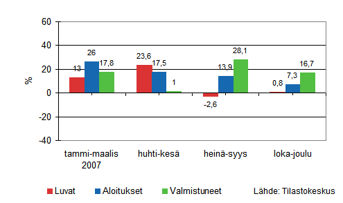 Vuoden 2007 viimeisellä neljänneksellä siirtyminen asuinrakentamisesta muuhun uudisrakentamiseen jatkui. Vilkkaana jatkuvan toimitilarakentamisen myötä uudisrakennuksia aloitettiin 7 prosenttia ja niitä valmistui 17 prosenttia enemmän kuin vuotta aiemmin. Myös rakennuslupien määrä kasvoi edelleen 1 prosentilla, mikä ennakoi uudisrakentamisen säilyvän vilkkaana myös alkuvuonna 2008.