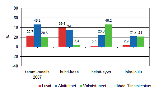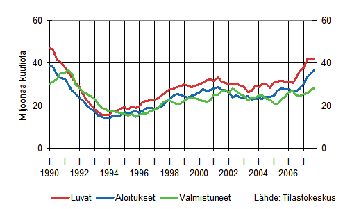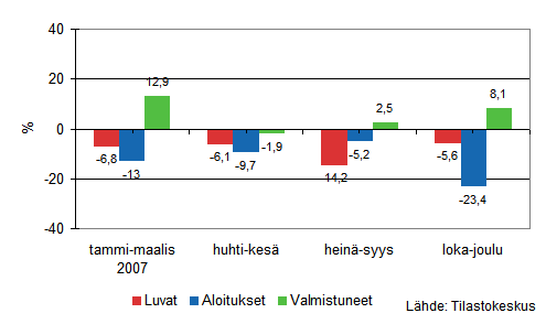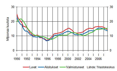 Asuinrakentamisen vuosia jatkunut kasvu tasaantui vuonna 2006 ja kääntyi lievään laskuun vuonna 2007. Vuonna 2007 aloitettiin noin 30 500 uuden asunnon rakennustyöt, mikä on noin 3 500 asuntoa vähemmän kuin vuotta aiemmin. Aloitusten väheneminen näkyy kaikissa asuinrakennustyypeissä: Omakotitaloasunnot -1 400 kpl, rivitaloasunnot -1 400 kpl ja kerrostaloasunnot -700 kpl. Vuonna 2007 myönnettiin rakennusluvat noin 32 700 uudelle asunnolle, mikä on 8 prosenttia vähemmän kuin vuotta aiemmin.