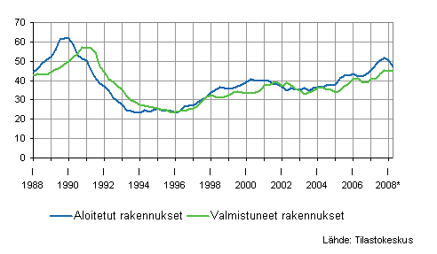 Aloitetut ja valmistuneet rakennukset, liukuvat vuosisummat, miljoonaa kuutiota