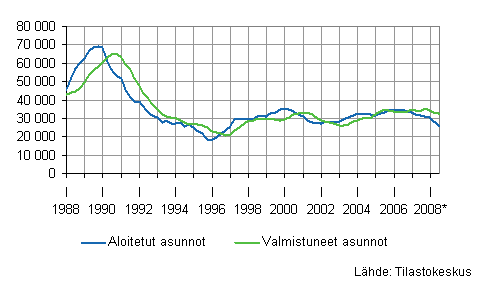 Aloitetut ja valmistuneet asunnot, liukuvat vuosisummat, kpl