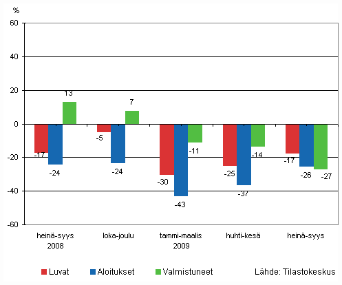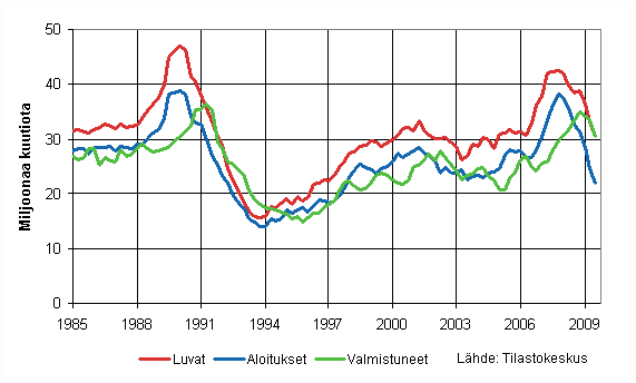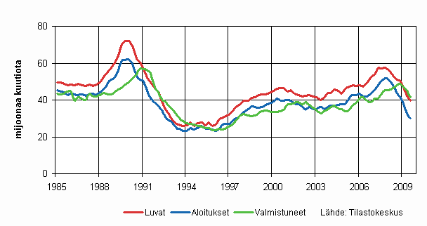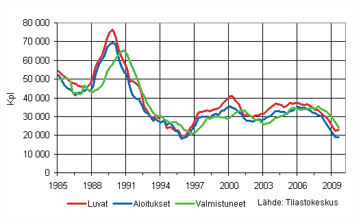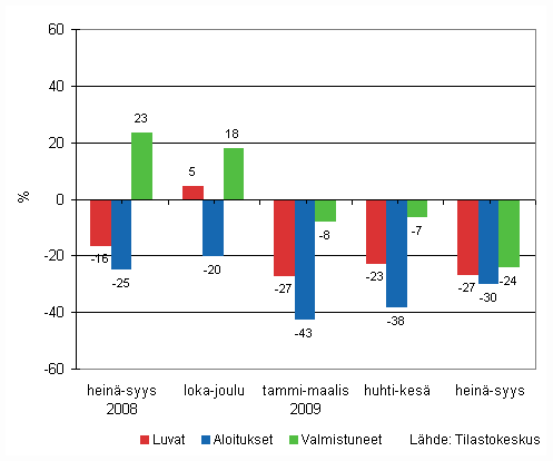 Vuoden 2009 kolmannella neljänneksellä aloitettuja asuinrakennuksia oli runsaat 2,6 miljoonan kuution edestä, mikä oli 13 prosenttia vähemmän kuin vuotta aiemmin. Vuoden 2009 heinä-syyskuussa aloitettiin noin 6 500 uuden asunnon rakentaminen, mikä on vain kolme prosenttia edellisvuotista vähemmän. Kerrostaloasuntojen aloitukset kasvoivat lähes viidenneksen kun vastaavasti pientalojen ja erityisesti rivi- ja ketjutalojen asuntojen aloitukset laskivat lähes samanverran.