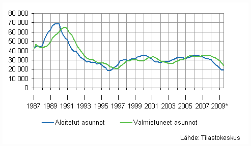 Aloitetut ja valmistuneet asunnot, liukuvat vuosisummat, kpl
