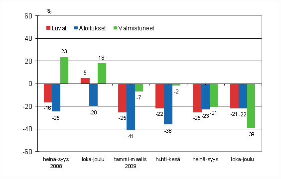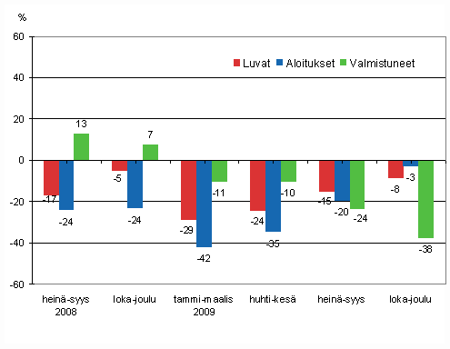 Vuoden 2009 loka-joulukuussa uudisrakennustöitä käynnistettiin noin 7,5 miljoonan kuutiometrin edestä, mikä tarkoitti sitä että aloitusten lasku hidastui merkittävästi ollen vain noin 3 prosenttia miinuksella. Suurin syy laskun hidastumiseen oli asuinrakennusten aloituskuutioiden merkittävä kasvu, myös julkisten palvelurakennusten aloitukset olivat plussan puolella verrattuna edellisen vuoden vastaavaan ajankohtaan.