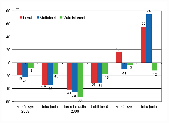 Vuoden 2009 viimeisellä neljänneksellä aloitettujen asuntojen määrät kaksinkertaistuivat edellisestä vuodesta. Loka-joulukuussa aloitettiin noin 7 000 uuden asunnon rakentaminen, kun vuotta aiemmin aloitettuja asuntoja oli 3 400. Kerrostaloasuntojen aloituksia oli kolme kertaa enemmän kuin edellisen vuoden vastaavana aikana. Myös erillisten pientalojen ja rivitalojen aloitukset kasvoivat lähes 46 prosenttia vuotta aikaisemmasta.