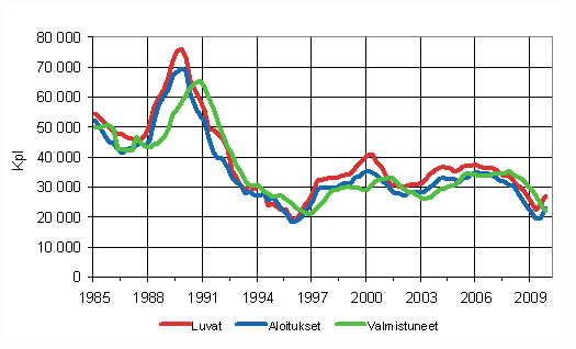 Vuoden 2009 viimeisellä neljänneksellä aloitettujen asuinrakennusten määrät nousivat reilusti plussan puolelle. Asuinrakennuksia aloitettiin lähes 2,7 miljoonan kuution edestä, mikä oli peräti 74 prosenttia enemmän kuin vuotta aiemmin. Hallituksen elvytystoiminnat erityisesti vuokratalojen rakentamiseen ovat mahdollisesti olleet vaikuttamassa aloitusten lisääntyvään määrään. Kerrostalojen aloituskuutiot lähes kolminkertaistuivat viimeisellä neljänneksellä. Tosin vertailussa on muistettava, että vuoden 2008 loppupuolella elettiin laman syvintä vaihetta ja vertailtavat määrät olivat pienimillään.