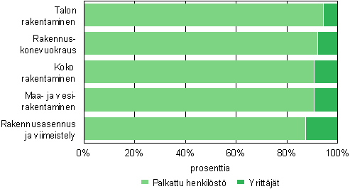 Rakentamisen toimialoista rakennusasennus ja viimeistely työllisti eniten. Toimialan henkilöstömäärän prosenttiosuus oli vajaat 40 prosenttia koko rakentamisen henkilöstöstä. Toiseksi suurin työllistäjä oli talonrakentaminen, jonka osuus oli runsaat 36 prosenttia. Pienimpänä sektorina oli rakennuskonevuokraus, jonka osuus oli vain reilun prosentin koko rakentamisen henkilöstöstä.