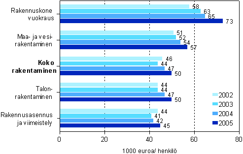 Tuottavuutta mitattiin jakamalla jalostusarvo koko henkilöstön lukumäärällä. Tuottavuus oli vuonna 2005 keskimääräistä suurempaa rakennuskonevuokrauksessa sekä maa- ja vesirakentamisessa. Vuoteen 2004 verrattuna tuottavuus kasvoi kaikilla rakentamisen päätoimialoilla. Koko rakentamisessa jalostusarvo henkilöä kohden oli 50 018 euroa vuonna 2005, nousua vuodesta 2004 oli lähes 7 prosenttia. Jalostusarvo jaettuna henkilöstön lukumäärällä oli keskimääräistä pienempää rakennusasennuksessa ja viimeistelyssä.