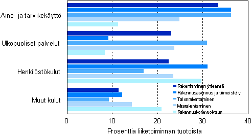 Rakentamisen kulurakenne oli edellisvuoden kaltainen, muutosten ollessa alle yhden prosenttiyksikön luokkaa. Liiketoiminnan tuotoista aine- ja tarvikekäytön osuus oli 33,5 prosenttia, ulkopuolisten palveluiden 23,1 prosenttia, henkilöstökulujen 22,6 prosenttia ja muiden kulujen 11,5 prosenttia.