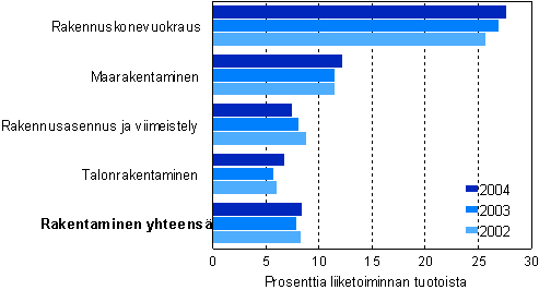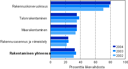 Tilastokeskuksen tilinpäätöstietojen perusteella rakentamisen liikevaihto oli 18,4 miljardia euroa vuonna 2004. Edelliseen vuoteen verrattuna liikevaihto kasvoi 8,9 prosenttia. Liikevaihdolla mitattuna rakentamisen kolme suurinta sektoria kasvoivat tasaisesti, mutta pienin eli rakennuskonevuokraus laski 2,1 prosenttia. Suuryritysten yhteenlaskettu liikevaihto kasvoi 9,9 prosenttia ja pk- yritysten 8,1 prosenttia.