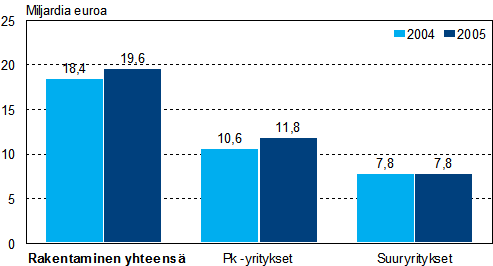 Tilastokeskuksen mukaan rakentamisen liikevaihto oli 19,6 miljardia euroa eli 1,2 miljardia euroa enemmän kuin vuonna 2004. Rakentamisen liikevaihto kasvoi 6,5 prosenttia. Suuruusluokittain tarkastellen rakentamisen pk- sektorin liikevaihto oli 11,8 miljardia euroa kasvaen 11,2 prosenttia ja suuryritysten yhteenlaskettu liikevaihto vastaavasti 7,8 miljardia euroa. Suuryritysten liikevaihto pysyi samana edellisvuoteen verrattuna.