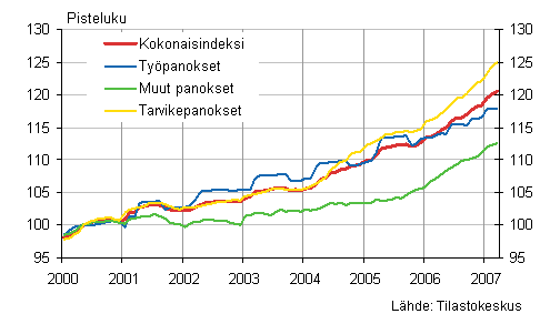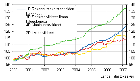Helmikuusta 2007 maaliskuuhun 2007 rakennuskustannusten kokonaisindeksi nousi 0,4 prosenttia. Tarvikepanosten hinnat nousivat 0,6 prosenttia ja muiden panosten hinnat 0,3 prosenttia. Työpanosten hinnat pysyivät ennallaan. Maaliskuussa tarvikepanosten osalta nousua oli muun muassa betoniteräksen, puukannatteiden sekä metalliovien ja -ikkunoiden hinnoissa. Maaliskuussa oli puolestaan pientä laskua sähköjohtojen ja sähkölämmittimien hinnoissa.