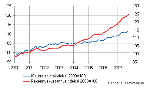 Rakennuskustannusindeksi 2000=100 ja kuluttajahintaindeksi 2000=100