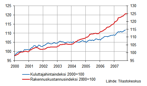 Rakennuskustannusindeksi 2000=100 ja kuluttajahintaindeksi 2000=100
