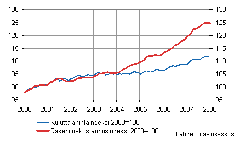 Rakennuskustannusindeksi 2000=100 ja kuluttajahintaindeksi 2000=100