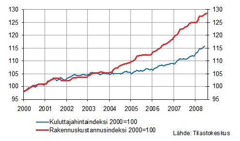 Rakennuskustannusindeksi 2000=100 ja kuluttajahintaindeksi 2000=100