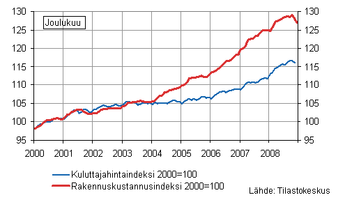 Rakennuskustannusindeksi 2000=100 ja kuluttajahintaindeksi 2000=100