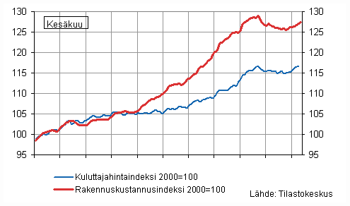 Rakennuskustannusindeksi 2000=100 ja kuluttajahintaindeksi 2000=100