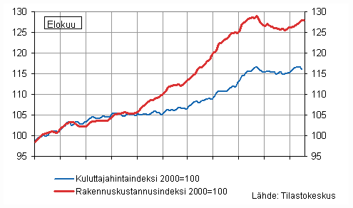 Liitekuvio 1. Rakennuskustannusindeksi 2000=100 ja kuluttajahintaindeksi 2000=100
