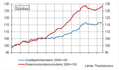 Liitekuvio 1. Rakennuskustannusindeksi 2000=100 ja kuluttajahintaindeksi 2000=100