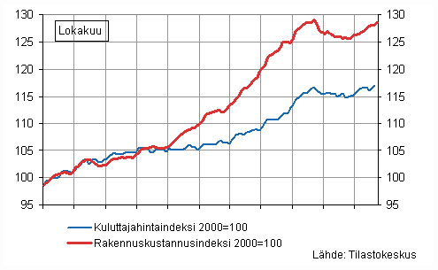 Liitekuvio 1. Rakennuskustannusindeksi 2000=100 ja kuluttajahintaindeksi 2000=100