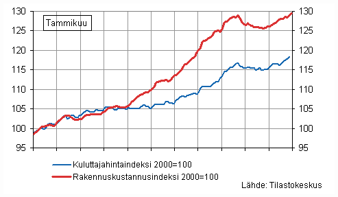 Liitekuvio 1. Rakennuskustannusindeksi 2000=100 ja kuluttajahintaindeksi 2000=100