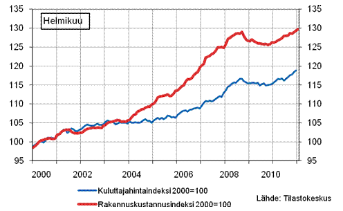 Liitekuvio 1. Rakennuskustannusindeksi 2000=100 ja kuluttajahintaindeksi 2000=100