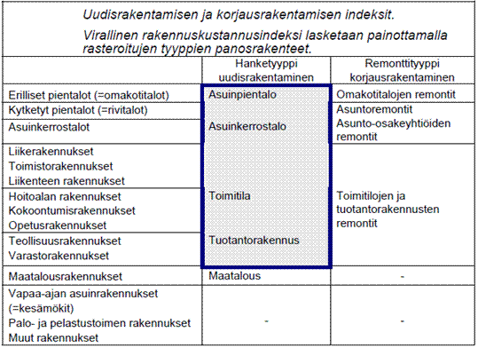 Alla oleva taulukko kuvaa virallisen rakennusluokituksen (talotyyppien) yhteyden rakennuskustannusindeksin 2010=100 laskennan pohjana käytettyihin hanke- ja remonttityyppeihin. Hanketyypillä tarkoitetaan taulukon mukaista kokonaisuutta kuvaamaan muodostettua laskennallista yksikköä.