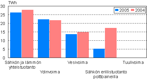 Kuvio 2. Sähkön tuotanto tuotantomuodoittain 2004 ja 2005