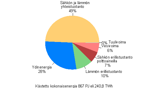 Kuvio 4. Käytetty kokonaisenergia tuotantomuodoittain sähkön ja lämmön tuotannossa 2005