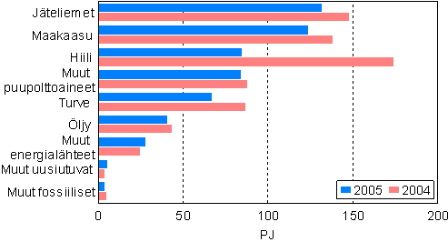 Kuvio 5. Polttoaineiden käyttö sähkön ja lämmön tuotannossa 2004 ja 2005