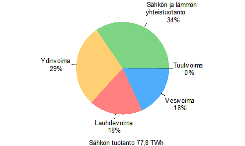 Sähkön ja lämmön yhteistuotanto pysyi merkittävimpänä sähköntuotantomuotona, sähköstä 34 prosenttia tuotettiin yhteistuotannolla. Vähentymä edellisvuoteen verrattuna oli 3 prosenttia. Ydinvoimalla tuotetun sähkön määrä nousi 2 prosenttia ja sen osuus sähkön tuotannosta oli 29 prosenttia. Lauhdevoima pienentyi lähes viidenneksen, mikä puolestaan laski lauhdevoiman osuuden sähkön tuotannosta 18 prosenttiin. Edellisvuotisia paremman vesivuoden ansiosta vesivoiman tuotanto kasvoi 24 prosenttia, mikä nosti sen osuuden 18 prosenttiin. Tuulivoimaa tuotettiin edellisvuotta enemmän, kasvua oli 23 prosenttia. Tuulivoiman osuus sähkön tuotannosta pysyi 2 promillessa.