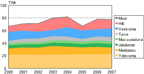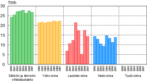Vuonna 2007 Suomessa tuotettiin sähköä 77,8 terawattituntia (TWh) eli miljardia kilowattituntia (kWh) Tilastokeskuksen sähkön ja lämmön tuotantotilaston mukaan. Määrä oli prosentin pienempi kuin vuotta aiemmin. Kaukolämmön tuotanto ja teollisuuden käyttöön tuotettu lämpö pysyivät edellisvuoden tasolla. Kaukolämpöä tuotettiin 33,5 TWh ja teollisuuslämpöä 61,7 TWh.